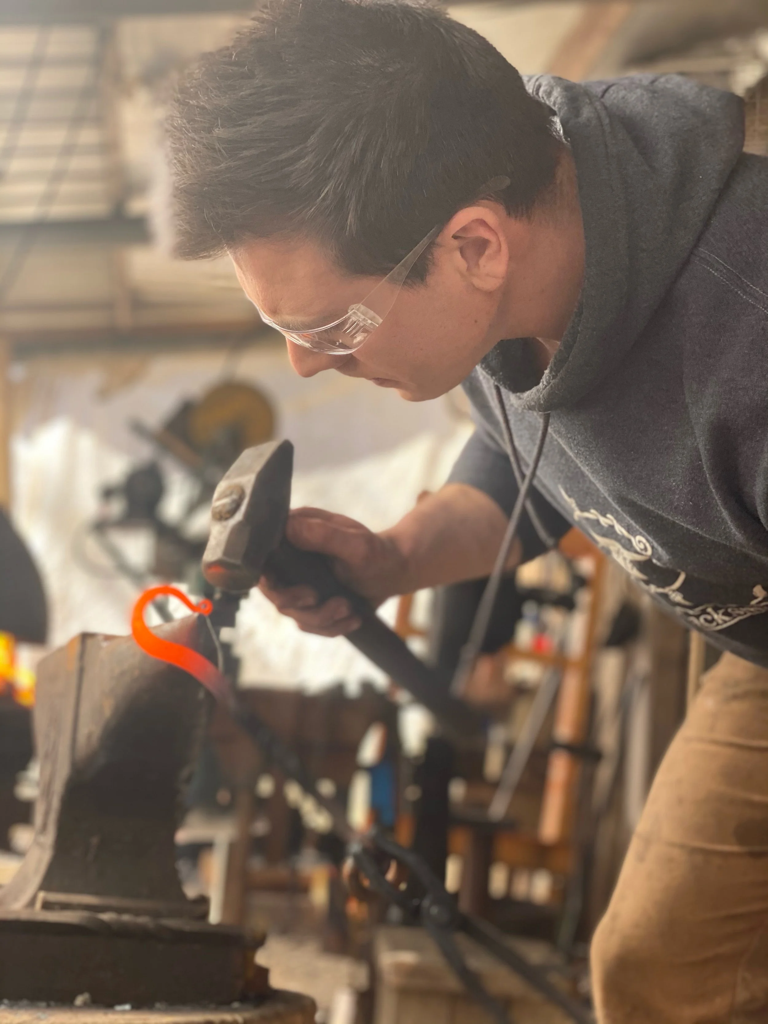 As a teenager, I was unable to participate in activities like baseball or playing video games. I spent much of my time outdoors building treehouses, forts, and experimenting with simple machines. While attending a local festival I was inspired by a blacksmith; I was intrigued by the concept of shaping a metal bar with heat and hammer. I quickly researched and built my own coal forge and began to hone my blacksmith skills. This gave me the ability to forge my own tools and then I began to create - metal and wood sculptures, ornate railings, metal art, and custom home décor.